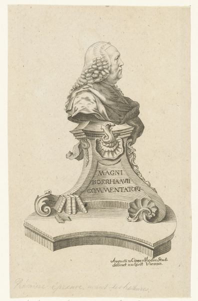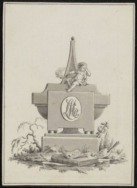Jean Bernard created this print of a funerary monument, with etching, at an unknown date. The monument is topped by a putto, a cherubic figure common in memorial art, and bears the initials of Louis Metayer. This print exists within a larger cultural context of memorial art in 18th-century Europe. During this period, artistic patronage often came from wealthy individuals or institutions like the church, which influenced the subjects and styles of art. Memorial art served a public function, reinforcing social hierarchies and commemorating individuals of status. The inclusion of a putto and classical architectural elements speaks to the enduring influence of classical antiquity on European art and culture. To understand this print fully, one might research the Metayer family, their social standing, and the artistic conventions of funerary art in 18th-century France. The Rijksmuseum's records, along with genealogical databases, and period journals, would offer valuable insights. This kind of contextual information helps us understand how art reflects and reinforces the values of its time.
