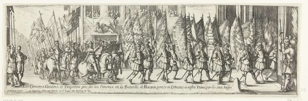 Editor: So, this is "De lijkstatie van de koningin, tweede deel, tweede helft, 1695," a pen drawing by Romeyn de Hooghe, currently held in the Rijksmuseum. It's quite detailed; I'm struck by how it documents what appears to be a procession. What do you see in this piece, in terms of its cultural context? Curator: I see a very deliberate piece of political imagery, deeply embedded in the power structures of the late 17th century. This wasn't just about memorializing a queen. Think about who commissioned it, where it was displayed. How does it solidify the monarchy’s narrative for the public? Editor: That’s a great point. I hadn't considered the commissioning aspect. It definitely portrays a very organized and impressive display of royal power. Almost like propaganda? Curator: Precisely! The procession itself, carefully orchestrated and meticulously rendered, acts as a powerful form of visual propaganda. Consider the historical context: The Dutch Republic, constantly vying for international prestige. A lavish funeral reinforces national pride and displays power, both internally and to rival nations. What do you think about the choice of printmaking as the medium? Editor: Printmaking makes it widely accessible. More people get to see it, spreading the message further. It's not just an image for the elite. Curator: Exactly. It takes the spectacle of the funeral, traditionally a very exclusive event, and reproduces it for broader consumption. In doing so, the monarchy controls the narrative, shaping public perception. Editor: So, it’s less about mourning and more about solidifying power? I mean, both, probably? Curator: The two are intertwined. Public mourning *becomes* a tool for legitimizing power. Looking at the work, what symbols jump out at you, reinforcing that legitimacy? Editor: The flags, the armour, the sheer number of figures... it all conveys authority. I hadn't thought about it as being explicitly designed to communicate those things so deliberately. It makes me consider the role of art in politics in a completely different light. Curator: And that's the beauty of it. This image reminds us that art doesn't exist in a vacuum. It is always in conversation with the society that produces and consumes it. Editor: I'll definitely look at art with more of a historical and political lens now. Thanks for sharing your insight!