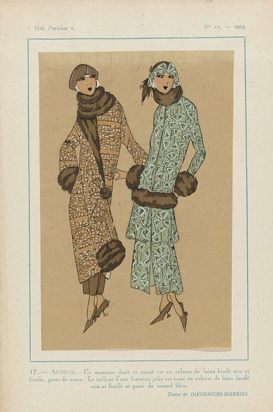 G-P. Joumard created this print titled ‘Très Parisien, 1925, No. 9, Pl. 15. - PAGODE’. The image presents a glimpse into the world of Parisian fashion during the Art Deco movement. This was a period characterized by dramatic social and political change, especially for women, after the First World War. The models are adorned in garments that reflect the era's embrace of luxury and modernity. Yet, beneath the surface of elegance, there's an undercurrent of the complex societal dynamics surrounding femininity and consumerism. Fashion in the 1920s became a powerful tool for women to express their evolving identities. These clothes allow us to consider the aspirations, as well as the constraints, shaping women's lives during this transformative period. How did the commercial and artistic worlds meet to produce new ideals for women's identity?