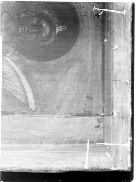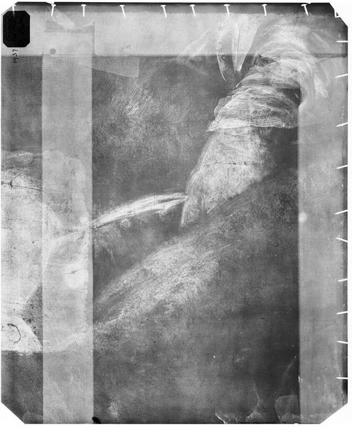 Editor: This is an X-radiograph of "Erasmus," a film of 14 by 17 inches by an anonymous artist. It’s fascinating to see a painting stripped down to its bare bones, revealing what lies beneath. What can we learn from this process? Curator: The X-radiograph emphasizes the physicality of art production. Look at the different densities; they reveal the artist’s layering, their process. How does seeing these material decisions change your understanding of the finished painting and the labor involved? Editor: It makes me consider the intent of the artist; to conceal, to reveal, to change, through this process. Curator: Exactly. It challenges the idea of art as solely aesthetic, forcing us to consider the material realities and choices behind its creation. It's about understanding the means of production, not just the final product. Editor: I see it now, it shifts my perspective completely. Curator: Yes, analyzing the material provides a tangible link to artistic labor.