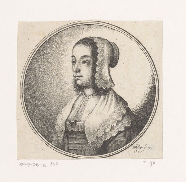 Wenceslaus Hollar created this print, "Woman with low décolleté and lace cap," using etching, a technique that requires immense skill. The process begins with a metal plate covered in a waxy, acid-resistant layer. Hollar would have used a sharp needle to draw through this layer, exposing the metal beneath. Then, the plate is immersed in acid, which bites into the exposed lines, creating grooves. The deeper and wider the grooves, the more ink they will hold, resulting in darker lines on the final print. The plate is then inked, wiped clean, and pressed onto paper, transferring the image. Think about the labor involved in the production of lace at this time. It was incredibly time-consuming. This portrait encapsulates how luxury goods became more accessible through printmaking. It challenges our ideas about value, skill, and labor then, as it still does today.