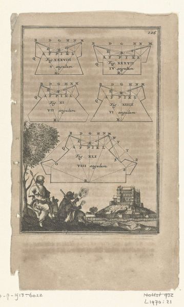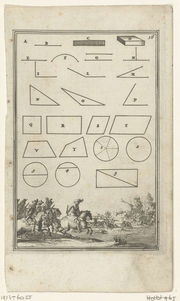 Curator: Looking at this fascinating print, made with engraving, is a page taken from Allain Manesson Mallet's 'Den Arbeid van Mars,' illustrated by Romeyn de Hooghe, dating back to 1672. Editor: Okay, wow, my initial impression is... intensely geometrical. It’s like a blueprint met a pastoral scene and had a very precise, very linear baby. Is it meant to be unsettling? Curator: In the context of the 17th century, the "Arbeid van Mars" speaks to the relationship between warfare and knowledge. It explores how mathematical precision serves martial ambitions, connecting theoretical diagrams to their practical applications in siege warfare. It asks us to examine militarism’s impact across societies, using intersectional views about identity, nation, and power, so we see the geometries as an ordering of destruction itself. Editor: Huh, I dig that subversive edge. The top half is nothing *but* diagrams - stark and rational, really kind of cold. Then, you glance down and see this idyllic, almost classical little landscape vignette happening beneath. The whole print has such a specific baroque intensity—line work as meticulously cruel as the angles it’s mapping out. Curator: Precisely. The detailed figuration down below sets the diagrams in a wider narrative, highlighting both the tools of destruction and those who carry out and suffer from it. Think of how this imagery impacts gender: are men the primary drivers of violence while rendering women subject to this social impact? What position does history put ordinary citizens into? Editor: Okay, yeah, now the figures on horseback even look a little… ominous. All the rational structures above leading directly to conquest and impact. I mean it's like De Hooghe stuck two very different feelings together using very sharp edges. Curator: Absolutely, it makes us ask critical questions about whose perspectives are centralized in military discourse. Editor: It’s really something how an artwork so rooted in technical drawing can actually feel so, visceral, know what I mean? Thanks to that gorgeous little landscape… suddenly there is a story behind all this data and numbers. And Romeyn, man, that detail with his line work makes it zing with clarity, no question! Curator: Ultimately, 'Den Arbeid van Mars' challenges us to consider whose stories are centered and erased, and encourages critical reflection upon the intersectional systems embedded within practices that we sometimes assume neutral and natural.
