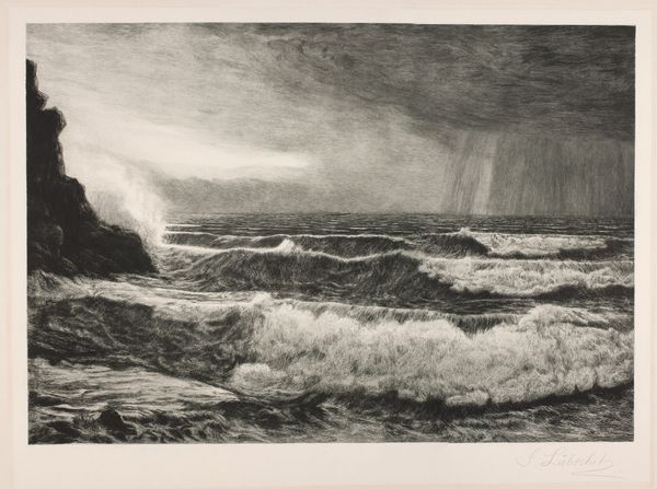Curator: This is James Craig Nicoll's etching, "A Smuggler's Landing Place," dating back to 1883. Editor: The instant I see it, I’m struck by the chiaroscuro effect—the strong contrast of light and dark gives the seascape a rather ominous feel. Curator: It's an interesting title considering this play with light, suggesting hidden activities under the cover of a tempestuous sky. The turbulent waves could certainly conceal clandestine arrivals. What symbols do you find especially evocative here? Editor: For me, the small boat battling the waves signifies the personal risks of smuggling, and perhaps broader social upheavals in a time of great wealth inequality, and even resistance against restrictive trade laws. The shoreline offers both refuge and exposure. I suppose those are fairly standard artistic dichotomies. What about you? Curator: That's very insightful. I was just contemplating that even beyond literal interpretations of crime, the smuggler has served as a potent archetype. Throughout history, the archetype symbolizes transgression, defiance of societal norms. This landing, rendered with such dynamic strokes, feels charged with that historical memory. Editor: I find myself wondering, too, about the intended audience. Nicoll exhibited widely, reaching many people, yet what impact did such a scene have in 1883, especially in America, on viewers encountering it? Was it meant to celebrate, condemn, or simply document such acts of defiance? Curator: Good questions, indeed. Looking at this particular work in its own cultural context, the landscape—a common feature in the Romanticism style of the era—serves here less as background than as an active participant. It intensifies the emotional drama. Editor: I can certainly see that. The Romantic underpinnings allow Nicoll to evoke strong feelings. Perhaps the social implications weren't his focus, leaving them for viewers to read in themselves, depending on their experience and their time. It does allow many meanings to coexist. Curator: Exactly. Thank you. Now when I return to this scene, my perception has been deeply colored, so to speak, and I see the artwork with completely renewed sight. Editor: Agreed! I’ll carry the questions of reception with me now—the impact this potent scene might have had, rippling outwards at the time, and beyond.