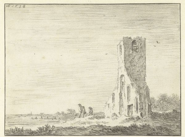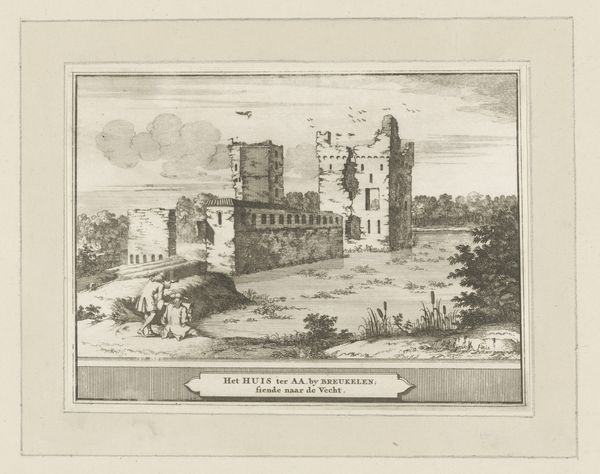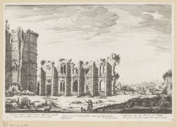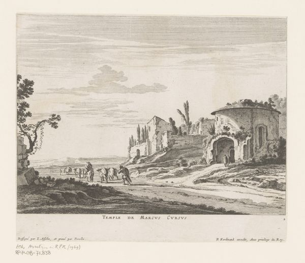 Editor: We're looking at Nicolas Perelle's "Landschap met figuren bij ruïne," an engraving from sometime between 1641 and 1695. The scene is dominated by the crumbling architecture; it's evocative, making me think of the passage of time and lost empires. What symbols or meanings jump out at you? Curator: The ruin itself is the most potent symbol, isn’t it? It speaks of fragility and transience. Think of what “ruin” signified in the 17th century: not just decay, but the weight of history, the remnants of past glory mingling with present reality. Doesn’t this specific ruin -- given its title implying a ruin from Jerusalem -- bring connotations of religious conflict and empire? What do you think is more of a focus, here: earthly glory, or spiritual sacrifice? Editor: Hmm, it’s difficult to choose; it’s probably a blend. The figures in the foreground seem almost oblivious to the ruin, suggesting daily life continues amidst these grand historical narratives. Is this contrast intentional, a comment on the human condition? Curator: Exactly! Notice how the artist has rendered the architecture— not purely for its aesthetic, but also for the *feeling* it evokes. Consider what those lines, those shapes, trigger in the viewer – perhaps even a kind of melancholy for an idealized past. It asks us to consider the emotional link between landscape and memory. Editor: So it’s not just a depiction of a place, but a commentary on history and how we relate to it. I guess the lasting impact of visual symbols relies on this kind of emotional connectivity? Curator: Precisely! The artist isn’t just showing us a ruin; he is inviting us to contemplate our relationship with the past and the ever-shifting nature of our cultural memories. Editor: Fascinating! I hadn't considered all those layers within what seemed like a simple landscape. Curator: These enduring images offer rich, resonating meaning far beyond their immediate depictions.