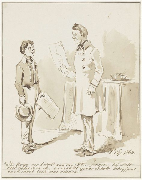 Curator: Before us is a work by Heinrich M. Krabbé, titled "Man in overjas en een militair in een interieur," created before 1898. Editor: The mood is tense. There's a stark, almost clinical feel to the line work, particularly the way the figures are rendered. Curator: Indeed. It's held in the Rijksmuseum and, though a drawing, the pen and ink medium speaks to a specific practice. Think about the era—pre-photography dominance in journalism, for instance. Editor: The contrast in texture is quite striking. The coat on the left is heavily shaded with hatching, compared to the almost diagrammatic representation of the military figure. I find my eyes drawn to the expressive qualities of the marks. Curator: Consider also how military culture might have been perceived at the time. This drawing, like many genre scenes of the era, may critique the militaristic posturing or reveal something about the nature of interactions between citizen and state. Editor: Yes, and the spatial arrangement heightens the tension. The framing devices – the wall, doorway and that awkwardly placed pipe emphasize their separateness, although the military man seems to reach for him. Curator: We see so many genre paintings depicting interactions among men. Some would emphasize codes around class, power, gender. Krabbé was deeply involved in socially-aware art, concerned with representing modern issues, and we need to account for that. Editor: I agree there's an element of social commentary, but I’m really drawn to the immediate impact. The stark lines and stark staging produce a visceral feeling in the viewer of anxiety. The picture's geometry echoes this emotion and almost amplifies it. Curator: Ultimately, this work gives us access to how certain artists worked to represent men within this social sphere during that moment. It's up to the viewer to unpack that tension. Editor: Right, I agree completely. Krabbé captures the subtleties of mood using rudimentary lines. It's all about the gesture for him, even now it manages to provoke a reaction.