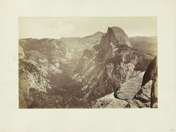 Carleton Watkins created this albumen silver print, titled "South Dome, 6,000 feet," at an unknown date. It's a study in contrasts: the sharp, textured foreground of the rock formations against the soft, muted background of the distant mountains, evoking both a sense of immediacy and timelessness. Watkins masterfully uses light and shadow to articulate the geological forms. Notice how the deep shadows carve out the contours of the rocks, emphasizing their mass and volume, while the highlights bring out the intricate details of the rock surface. The composition draws the eye upward, guided by the valley's depth and culminating in the imposing presence of the South Dome. The photograph not only captures the grandeur of the natural landscape but also reflects the 19th-century fascination with the sublime. By emphasizing the scale and raw power of nature, Watkins invites us to contemplate our place within it, questioning established notions of space and perception.