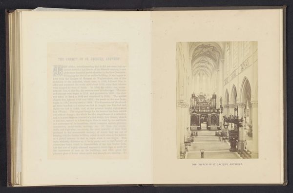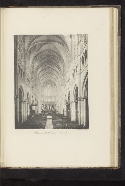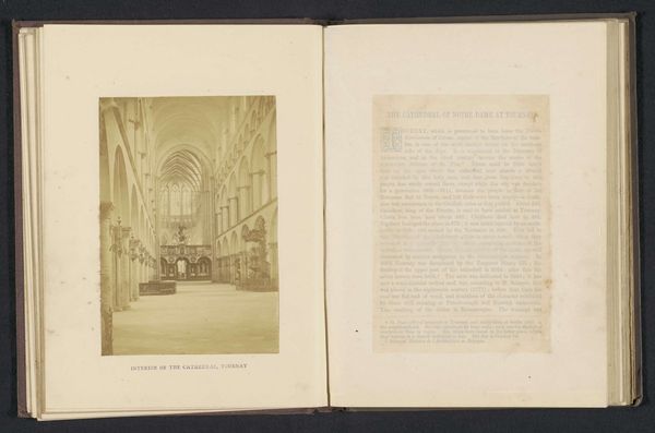 Curator: This gelatin-silver print captures the interior of the Antwerp Cathedral. It is entitled “The triple aisle, Antwerp cathedral,” and we believe it was created sometime before 1866 by the studio of Cundall & Fleming. The photograph offers a view down the length of the cathedral's nave, highlighting its soaring Gothic architecture. Editor: The composition creates such an incredible sense of depth and grandeur! The rows of columns recede into the distance, and the light filtering through the high windows really accentuates the cavernous space. It definitely evokes a sense of awe and spiritual contemplation. Curator: What is interesting about a piece like this, taken in the mid-19th century, is to see the power structures at work. We can see how images like these shaped perceptions of power, piety, and imperial reach. By displaying the grandeur of religious institutions, what political and ideological positions do you think this reinforces? Editor: The aesthetic and historical factors shaping these early photographs are always something to take into consideration. As a symbol of colonial power and wealth, what social responsibilities did churches uphold? Or, more relevantly, how did those actions diverge from religious teachings? It’s worth understanding how places of worship were funded, especially when so many faced inequalities in accessing these religious spaces due to social, economic, and gender constraints. Curator: Precisely. In examining photographs like "The triple aisle," we need to explore how the representation of such spaces contributes to broader discussions about power, access, and identity within religious institutions and within society more broadly. This includes recognizing not just the aesthetic appeal, but the complex social dynamics and histories interwoven into these visual records. Editor: Exactly. Visuals are never unbiased documents, especially when considering their use and access at a specific historical moment. This also causes me to wonder what role it may play in re-evaluating what histories and narratives have been forgotten due to photography’s influence.