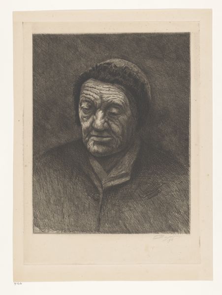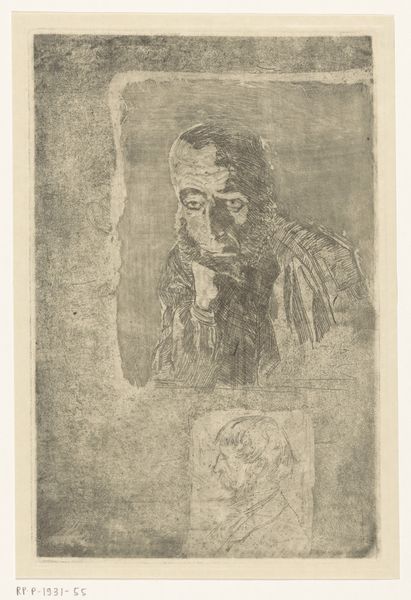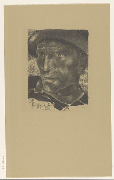 Curator: I’m immediately struck by the subject’s world-weariness; the face tells a story of hardship and resilience. The stark linework really accentuates the deep lines etched into his face. Editor: And what a face it is. We’re looking at Richard Nicolaüs Roland Holst’s “Brabantsche Fuikenzetter” or “Brabant Eel Trap Setter”, a linocut print created in 1931, now residing here at the Rijksmuseum. The title gives some insight, but it still conveys so much. Curator: It does. Beyond a portrait of a fisherman, I read the print as an allegorical representation of traditional lifeways in tension with modernity. Fishing with traps evokes a slower pace of life. Editor: Interesting. I notice the artist's control over light and shadow to model the figure's head; see how the light catches the brow and cheekbones. And, though the background is minimal, there’s texture suggesting reeds or grasses. That framing focuses attention firmly on the portrait itself. Curator: Those sharp, deliberately chosen angles speak to the modern artistic currents circulating at the time; a realism with an expressive edge. It makes me think of the Expressionists or the Social Realists, deeply invested in the human condition, particularly of the working class. There's something very Dutch about it too – a feeling of tangible grit and human scale. Editor: I’d agree it feels decidedly human. Roland Holst masterfully handles the stark contrast inherent in the linocut technique to capture a detailed, affecting likeness. Look at the use of varied line widths and depths of cut—a visual symphony. Curator: Looking closer, the man's gaze isn’t directed at us. His thoughts seem drawn inward, reflective of years spent observing the quiet rhythms of nature. It evokes feelings tied to our connections to a rural past slipping into memory. Editor: Precisely! And these elements combine to create such a memorable portrait. Curator: Indeed, the artist invites a meditation on themes of labor, memory, and the changing landscape. Editor: It's been an engaging and quite evocative experience viewing it. Curator: Absolutely; each mark a testament to both the artist’s vision and the enduring power of the human face.