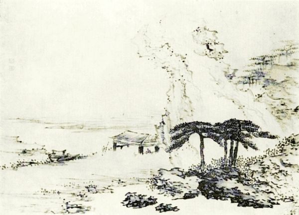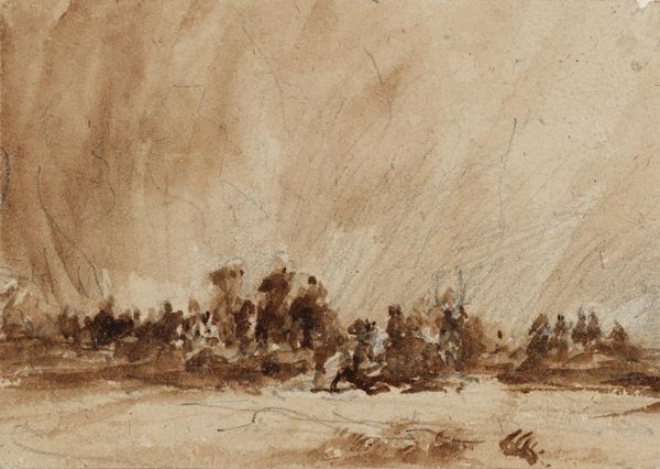 Editor: This quick sketch, made by an unknown artist of the British School, shows a park scene in brown ink. It feels like a fleeting memory, quite dreamlike. What do you see in this piece? Curator: The trees act as symbolic gatekeepers, figures huddle beneath them. The ink washes suggest a permeable boundary between inner thought and outward expression, like a half-remembered myth. Editor: Myth? That’s interesting. The seated figure almost disappears into the base of the tree. Curator: Yes, it is as if the self seeks refuge within the ancient wisdom of nature. Do you think this search for meaning resonates today? Editor: Definitely. I hadn't thought about it in terms of seeking refuge. Thanks for that insight. Curator: My pleasure. Every image holds a thousand stories, waiting to be discovered.
