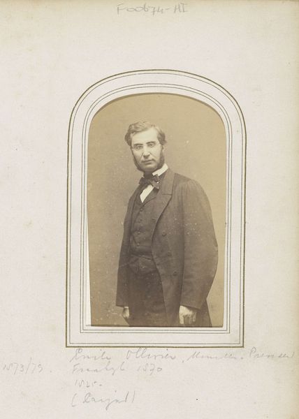 Curator: Here we have an untitled photograph of an unidentified sitter by George Kendall Warren, residing at the Harvard Art Museums. Editor: It’s remarkable how this small image has such a striking, almost melancholic presence, isn’t it? The subdued tones really capture a certain mood. Curator: Absolutely. It speaks volumes about the rise of portrait photography and its role in shaping social identities and the broader visual culture of the era. Editor: I’m drawn to the materiality itself. Consider the labor and chemical processes involved in creating this image, making each print precious and unique. Curator: True. And how the sitter’s clothing, the cut of his hair, all project a carefully constructed image aligning with the expectations of Victorian society. Editor: Yes, every aspect, from the chemicals used to the sitter’s pose, tells us about the material conditions and aspirations of the time. Curator: Looking at this, I’m reminded how photography democratized portraiture, yet it also reinforced existing social hierarchies. Editor: It's a potent reminder that even the most straightforward image carries layers of meaning and production. Curator: Indeed, it's a fascinating glimpse into a past carefully constructed and presented.