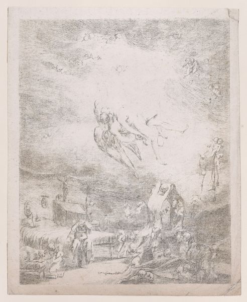 Editor: So, this is Lorenz Frølich’s "Illustration til 'The Lord's Prayer'," from 1863. It's an engraving, so a print. I'm struck by the stark contrast between the earthly figures and the ethereal realm above. What do you see in this piece beyond a religious scene? Curator: This work invites us to consider the power dynamics embedded within religious narratives, and the way such images might have shaped social hierarchies. Note how Frølich visually constructs a celestial authority looking down upon the earthly figures. How does this visual representation of power reinforce existing structures within 19th-century Danish society, particularly concerning faith and social class? Editor: That's a good point. The people at the bottom seem almost… pleading, or desperate, maybe. It makes me wonder about their individual experiences of faith versus the institution of religion. Curator: Precisely! Consider the socio-political context of 1863. What societal anxieties or movements might have influenced Frølich’s interpretation of the Lord's Prayer? How could interpretations of gender roles at that time influence the visualization of those figures praying? Editor: Hmm, maybe a growing tension between established religious dogma and individual spirituality, a move toward secularism possibly? Also perhaps traditional gender roles put pressure on women in particular to embody and uphold traditional values, like in a religious setting. Curator: Exactly. By examining the artist’s choices, the composition, and the historical context, we can unravel how art not only reflects but also actively participates in shaping ideologies and influencing social norms. And of course, consider accessibility. Prints made religious ideas available to a wider audience beyond the church walls. How might the *reproducibility* of this image amplify its socio-political impact? Editor: That’s fascinating. I didn’t realize how much social commentary could be packed into one religious illustration. Thinking about its reproduction makes me look at it from an entirely new perspective. Curator: Art serves as a lens through which we can analyze societal values, power structures, and even individual experiences, doesn't it? Always dig deeper into the context of these works to learn more.