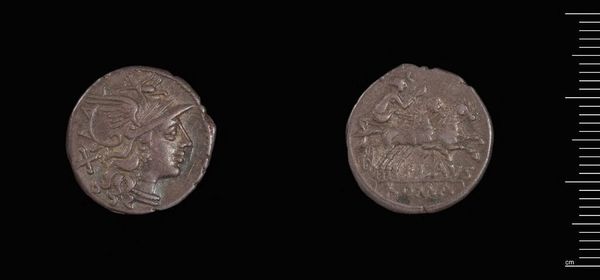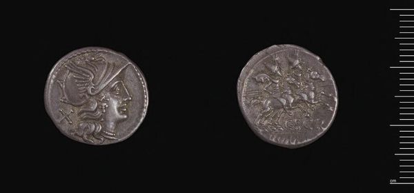 Editor: Here we have the Denarius of N. Fabius N.f. Q.n. Pictor, a Roman coin. I find it interesting how symbols of power and identity can be so intricately inscribed on such a small object. What do you make of it? Curator: Indeed. These coins are fascinating visual records. Notice the helmeted head of Roma on one side. What does that image evoke for you? Editor: Perhaps strength, Roman identity… Curator: Precisely. And on the reverse, we see Victory driving a biga, the two-horse chariot, an enduring symbol of triumph. The artist, Pictor, is literally picturing himself with Victory. Editor: So, it's not just currency, it's a self-promotion piece? Curator: Exactly. The coin transmits cultural memory. It carries layers of meaning about Roman ideals and the moneyer's ambition. Editor: That’s a completely different way of thinking about a coin. Thanks! Curator: You're welcome. It shows how even seemingly simple objects can reveal complex cultural narratives.