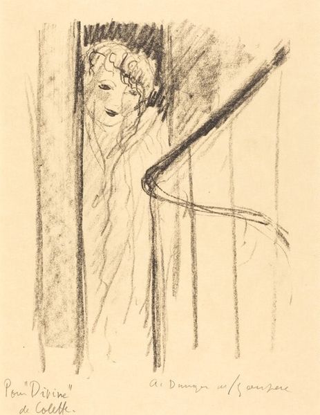 Curator: Look, this is Henri de Toulouse-Lautrec's "Portrait of the Singer Yvette Guilbert on Stage" from 1894, housed right here at the Rijksmuseum. It's a captivating drawing rendered in pencil. Editor: It's striking. Stark, almost. The pose is so angular and dominating that it almost bleeds into the white, making Guilbert seem like she's wrestling the performance space itself. Curator: Indeed. Guilbert was a major figure in fin-de-siècle Paris—a celebrated café-concert singer who cultivated a distinct persona. Toulouse-Lautrec depicts her here in that element, capturing her unconventional beauty. She defied normative femininity, a symbol of female agency during a period of great societal change and artistic experimentation. The deliberate roughness in lines challenges established notions of ideal representation, doesn’t it? Editor: Absolutely. It's precisely those rough lines, the almost grotesque exaggeration of features, which draw attention. He has this wonderful economy of means: the gloves are defined by the merest squiggle. It feels almost brutal. Semiotically, the lines construct her essence. It almost distorts the common visual grammars that are meant to represent elegance. The almost total whiteness adds a ghostly touch. Curator: Exactly! Lautrec's work serves as a potent reflection of broader socio-political trends of the time. He critiqued bourgeois respectability by immortalizing these marginalized yet empowered figures of the Parisian nightlife. These were often outsiders, working-class performers and artists who pushed boundaries. We also should see Guilbert as part of the larger discussion on modern celebrity, in which figures created themselves, building images. Editor: And consider the stage. It acts almost as a metaphorical blank canvas; its very minimalism intensifies Guilbert's own image. Without ornate distractions, the composition is solely defined through her—her pose, presence. It forces a contemplation not just about the female image but how performance interacts with representation, and reality. Curator: In truth, this piece is not simply a depiction, but a statement on identity, on gender performance. Lautrec makes us question who is allowed representation, and how that shapes not only history but the present. Editor: For me, the piece’s formalism embodies these ideas with such grace and grit. The composition allows a concentrated reading that leads back to these concepts on image-making in a deeply thoughtful, visual cycle.