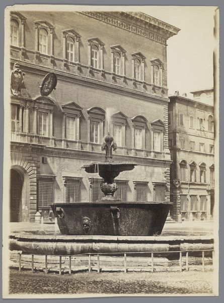 Curator: What a classically beautiful vista! Editor: Agreed. It almost feels too perfect, like a staged movie set instead of an organic cityscape. Curator: We're looking at a photograph, "Trevifontein te Rome," putting us sometime between 1851 and 1900, capturing the Trevi Fountain. Notice the gelatin-silver print used in the photographic process. The choice of materials in photographic prints like this reflects both aesthetic and practical considerations during the period. Editor: I'm struck by the composition—the stark geometry of the building juxtaposed with the wild, baroque exuberance of the fountain. And that blurred effect of the water, suggesting constant motion frozen in time, thanks to photographic materials available back then. The contrasts emphasize a certain dynamic tension, right? Curator: Certainly. It also reflects the era’s views of labor: Consider how this contrasts human-made static architecture against freely flowing elements. How are laborers engaged to maintain such a grand fountain versus laborers living in cramped apartments next door, or further beyond the camera’s perspective. It all seems tied to specific societal roles and expectations of beauty and luxury. Editor: I do like how the photographer framed it though! The shadows give such depth, pulling you into the scene despite the rather limited tonal range characteristic of older prints. Those statues on the fountain— Neptune perhaps?—almost seem to come alive with drama. Curator: I am much more keen about whether the workers in this region were granted artistic license as it pertains to water use, or where such fountains and public gathering places truly designed with public benefit as it claims. The narrative it builds in our collective imaginaries says as much. Editor: Interesting angle! But I feel it is in that tension of historical record against a created reality of luxury and design in plain sight. The picture asks as much of you. Thank you, Curator, for sharing the materiality-bound social context that informs its historical era and its complex meanings. Curator: And thank you for drawing us closer to understand its place within our culture.