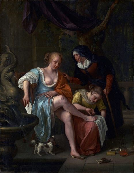 Hendrick Heerschop created "Erichthonius found by the daughters of Cecrops" with oil on canvas. It depicts an arrangement of figures in a theatrical manner, set against a classical backdrop. The soft light gently illuminates the subjects. The composition of the painting guides the viewer's gaze through a semiotic dance of observation. The daughters of Cecrops are grouped together with the daughters' gazes converging on the infant Erichthonius, nestled in a basket. Through their expressions, Heerschop explores the contrast between curiosity, fear, and maternal instinct. The background bust and classical architecture contrast with the human drama unfolding. The painting functions as a cultural artifact, demonstrating the dynamism of artistic interpretation. This dynamism invites us to ponder the nature of discovery and the complexities of human emotion.