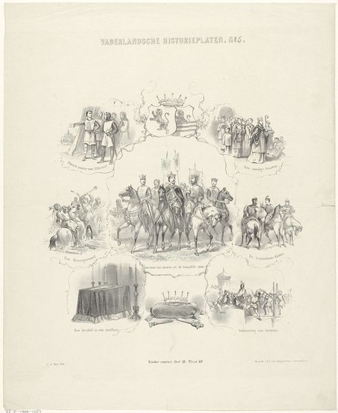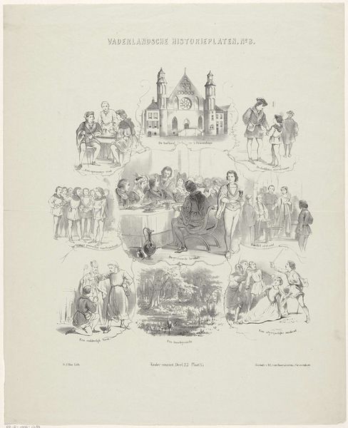 This lithograph titled "Musée Comique. Page 30," created by the Van Lier Brothers, presents a series of vignettes rendered in intricate detail. The composition is segmented, almost like a comic strip, inviting us to navigate through a world of satirical observations. The use of line is particularly striking, forming dense cross-hatching that defines form and shadow. This technique not only adds depth but also conveys a sense of the bustling urban life being depicted. Each scene, though distinct, is united by this consistent stylistic approach, creating a cohesive visual experience. The artists employ a keen sense of caricature, exaggerating features to emphasize the comedic or absurd aspects of their subjects. This exaggeration, a form of visual semiotics, allows viewers to quickly grasp the underlying social commentary. By challenging established norms through humor, the Van Lier Brothers engage in a discourse that questions the very fabric of societal values. The overall structure of the print, therefore, is not merely decorative but serves as a framework for decoding the cultural narratives embedded within each scene.