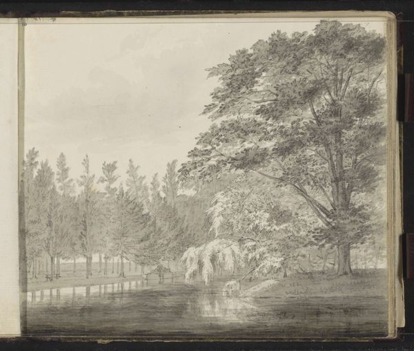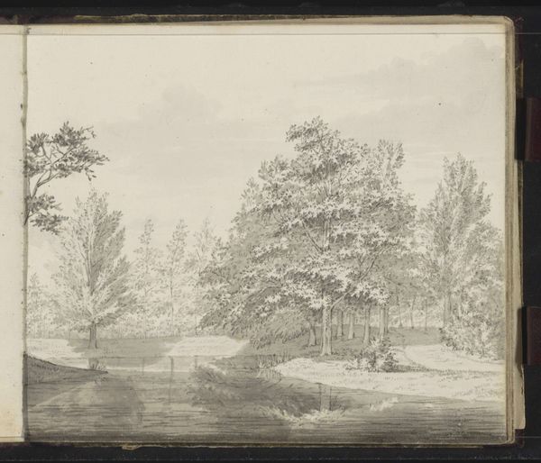 Editor: This is "Weide met omheining, water en een poort," a pencil drawing by Hendrik Abraham Klinkhamer, made sometime between 1820 and 1872. It’s quite a simple landscape. I'm curious to know, what stands out to you about the work's context or its creation? Curator: I am intrigued by the materiality here. This isn't a grand oil painting, but a pencil sketch. Consider the accessibility of pencil and paper compared to oils and canvas in the 19th century. This choice democratizes art production, placing landscape drawing within reach of a broader segment of the population. Editor: So, the very material used reflects social access to artmaking? Curator: Precisely. Klinkhamer’s choice of pencil aligns this landscape with practices of field study and documentation. Pencil allows for rapid capture, for an easy engagement with a space. What labor does the making of a fence entail, for example? Consider too how the sketch exists inside the bounded context of the book from which it came – is it a commodity made for display or part of an archive of impressions? Editor: That makes me think about how fences themselves define the use of land, its resources. Curator: Indeed. The act of enclosing also relates to control, property, and even modes of extraction. Can we view the trees themselves as potential material, commodities? And think, too, about the production of the paper itself. Where might this sketch fit into debates about the pastoral versus industry? Editor: It's amazing how such a simple sketch can lead us to consider the means of its creation, social structure, and land usage all at once! Thanks! Curator: My pleasure. Viewing art through the lens of materiality opens doors to a deeper understanding of the socio-economic forces that shape artistic expression.