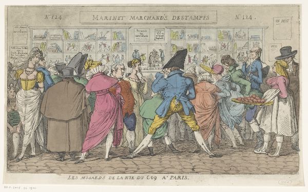 Curator: Look at this intriguing print, "Dandy Pickpockets, Diving" by Isaac Robert Cruikshank, housed here at the Harvard Art Museums. The scene’s full of satirical energy. Editor: Indeed, the frantic lines give it an almost desperate, frantic feel. The figures are rendered with such exaggerated, almost grotesque features. Curator: Precisely! It’s a commentary on social classes, capturing the underbelly of fashionable society. The dandy as a figure was often lampooned, and here, Cruikshank links that image to criminal behavior. Editor: The printmaking process itself – likely etching or engraving – allows for those fine, biting details. Note how the artist uses clothing and accessories to underscore the deception at play, it is interesting how he uses color. Curator: Absolutely. The location near St. James's Palace is significant, pointing to the proximity of wealth and opportunity to those who might exploit it. It critiques the era's social stratification. Editor: And it's all being created with a rather laborious process, underlining that even depictions of social ills are rooted in the social realities of labor and production. Curator: This image presents a glimpse into the art world's relationship to social critique. Editor: A fascinating intersection of materiality and moral judgement!