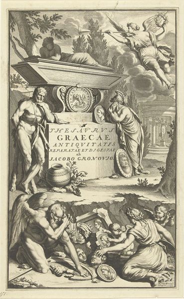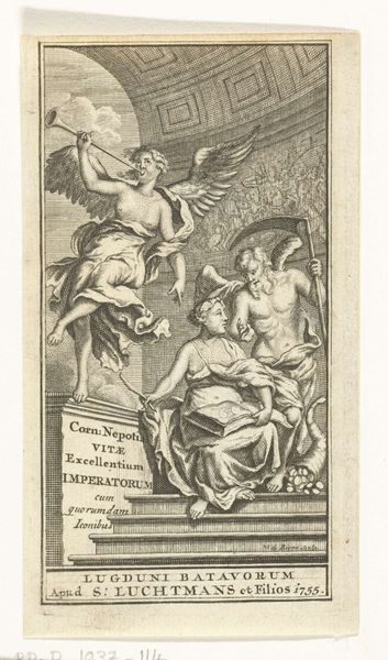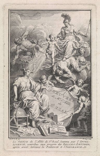 This print, "Waarheid beschrijft de levens en daden van Nederlandse schilders," was made by Pieter Tanjé in the 18th century. It’s an engraving, meaning the design was carefully incised into a metal plate, likely copper. Ink would have been applied, then the surface wiped clean, leaving ink only in the grooves. Finally, paper was pressed against the plate to transfer the image. The precision and detail of the lines are striking. Consider how the engraver meticulously created the textures of the figures’ skin, drapery, and the surrounding objects. The controlled, repetitive labor involved in engraving allowed for the wide distribution of images. This was crucial in the 1700s, when prints like this played a vital role in disseminating knowledge about art and culture. Engravings like this one, though seemingly distant from our contemporary understanding of "art," highlight how skilled craft practices have shaped the world of art. Tanjé's print makes you rethink traditional distinctions between fine art and craft.
