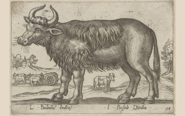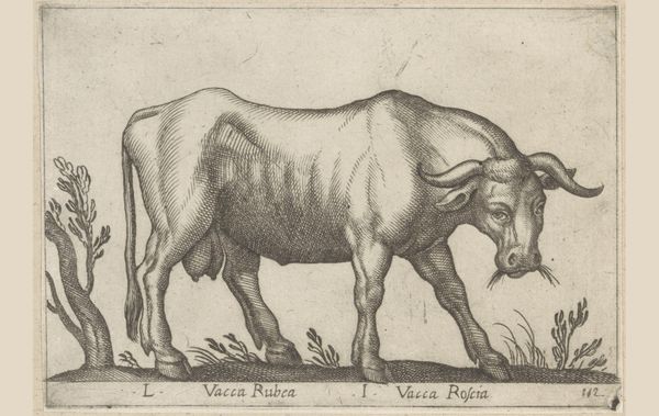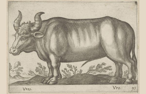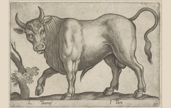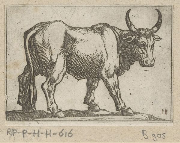 Editor: This is "Rund" by Antonio Tempesta, created before 1650. It's an engraving. It looks quite detailed for its size. I'm struck by the muscularity of the bull; it seems almost exaggerated. What are your initial thoughts? Curator: This image reflects a broader trend of its time. Consider the burgeoning natural sciences. The depiction of animals with anatomical accuracy became increasingly important. Do you think Tempesta was aiming for scientific representation, or is there something else at play here? Editor: I think there’s more. It seems a little too… noble, maybe? To just be scientific. Curator: Precisely! Remember, animal imagery often carried symbolic weight. The bull, for instance, can represent virility, power, even sacrifice. This print, displayed perhaps in a study or even disseminated more widely, becomes a visual assertion of those qualities for its owner, or the society that embraces such symbolism. How do you think its circulation may have influenced the public’s perception of animals? Editor: So it's not just about documenting the animal, but also about what that animal represents in the wider cultural imagination? Maybe shaping it? Curator: Exactly. Think about the context – Europe on the cusp of major political and social shifts. How might images of strength and dominance, embodied by the bull, have played a role in the political landscape? It encouraged certain virtues, in a way that art continues to do even today. Editor: I see. So a seemingly straightforward image is actually loaded with meaning reflecting society at that time. That gives me a lot to think about. Curator: Indeed, even the choice to disseminate information through prints democratized this shaping of culture, making it available to people who might otherwise be shut out of the patronage system that defined earlier eras. It has definitely made me reconsider the power of the art!