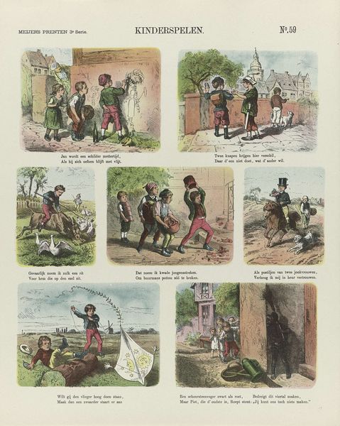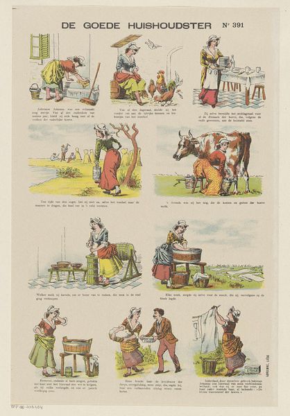 Editor: Here we have "Het erfdeel van Matthias", or "Matthias' Inheritance," created between 1894 and 1959. It's currently held at the Rijksmuseum and the artist's name is Gordinne. It appears to be some sort of print depicting scenes from a story, perhaps about the inheritance process? What do you see in this piece, formally speaking? Curator: Formally, this print employs a series of vignettes, each carefully arranged to contribute to the overall narrative. The composition strikes me as purposefully compartmentalized. Each scene exists within its frame, preventing a blurring of thematic elements and actions. Gordinne, by using division, directs the viewer's gaze sequentially. How does this structured approach affect your experience of the work? Editor: I suppose it makes it easier to follow the story, like a comic strip. The composition seems less about artistic expression and more about conveying information clearly. The drawing style appears rather simple and unrefined, in comparison to, let's say, more contemporary and avant-garde works. Does the lack of intricate detail impact the overall message of this piece? Curator: Detail, or its lack, becomes an aesthetic and expressive decision. Notice how Gordinne renders figures: the simplistic outlines emphasize action and role, not individual personalities. Moreover, consider the limited color palette. Restrained tones create a sense of uniformity, preventing any single scene from overpowering the others. Editor: That's an interesting point. By minimizing the artistic flair, the narrative elements gain prominence. I can definitely appreciate how the visual economy supports storytelling. Curator: Precisely. We see that, formally, the construction lends itself to accessibility; that the artist subordinates personal flourish to serve a story. In scrutinizing Gordinne's artistic choices, we begin to appreciate the intentionality in her medium.