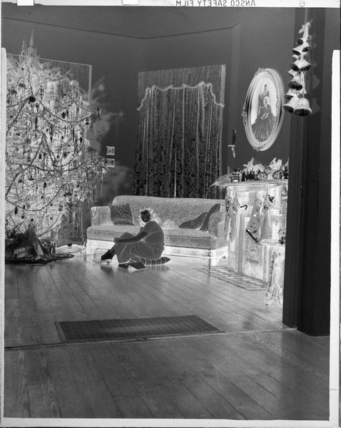 Curator: Here we have Martin Schweig’s “Untitled (portrait of young ring boy at wedding),” an image that, though undated, speaks volumes about its era. Editor: Oh, wow, that’s… haunting. Is it the inverted tones? He looks like a little phantom, all dressed up with nowhere to run. Curator: The image's power partly stems from its capture of social performance and the expectations placed on children in formal settings. Consider how weddings reflect specific cultural values and family dynamics. Editor: Right, but there’s something else. That shadow… it just sucks all the joy out of the scene. What’s he holding, anyway? Curator: He’s holding what seems to be a toy animal. These staged photographs reveal the social roles children occupied. Editor: Still, you get the feeling that kid would rather be anywhere else. Curator: Exactly. This tension is why Schweig's picture is so compelling. It invites us to consider childhood innocence in a world of adult expectations. Editor: I guess there is a whole story in the contrast. It's eerie, beautiful, and a little heartbreaking.