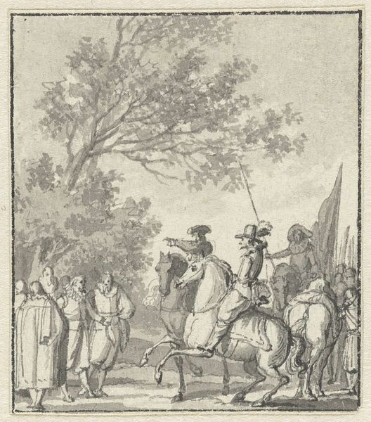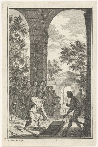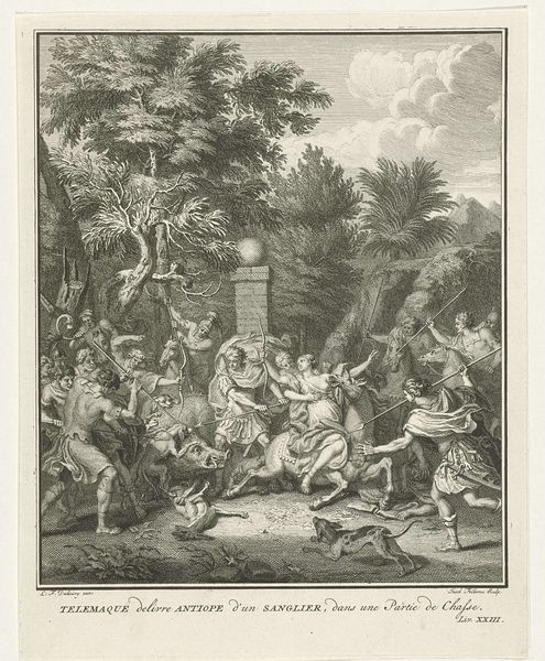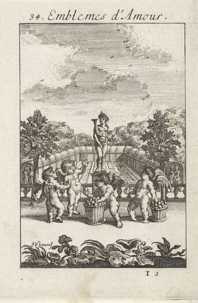 Curator: This engraving by Jan van Vianen, created in 1686, is entitled "Atalanta en Hippomenes" and resides at the Rijksmuseum. I find the composition intriguing. Editor: My initial impression is a strange mix of dynamic action and societal constraint; a group watches as this pursuit unfolds, overseen by an older, controlling figure. Curator: Precisely. Van Vianen masterfully uses line work to create a sense of depth. Notice how the lines become finer and more closely spaced in the background to simulate distance, almost creating a stage for the drama. Semiotically, the figures’ musculature embodies classic heroic forms, while the stylized trees seem to gesture and lean towards the runners. Editor: That heroic form stands in sharp contrast to Atalanta's forced competition, though. We know the story, Hippomenes defeats Atalanta in the race by using golden apples to distract her. This is a visual manifestation of a culture that prioritizes male achievement. Curator: The line engraving technique enhances the contrast of light and shadow, providing texture that alludes to movement. We see Atalanta’s gown flowing, frozen in the engraver's hand but very evocative of physical exertion. Consider the philosophical implications here, we are made to question ideas around surface, depth, perspective, and truth as the artist mediates mythology and its impact. Editor: That flow can also speak to a certain performativity surrounding women's roles at the time. We are invited, maybe forced, to witness her downfall. The active elements of the print emphasize power relations and socially prescribed performances of gender roles. Even more intriguing is that title: "Emblems d'Amour"—isn't there a paradox given the trickery involved in the couple coming together? Curator: That ambiguity, a tension in representation, serves to engage us. Van Vianen delivers narrative richness that draws us into the philosophical underpinnings, demanding reflection on not only technique, but the art of storytelling through spatial, chromatic, and haptic suggestion. Editor: Right, by connecting historical narrative to contemporary examination we uncover more layered dialogues. Curator: Exactly. The engraving's interplay of dynamism and stillness highlights not only technical adroitness, but philosophical questioning. Editor: And by interpreting the image through the lens of love, power and gender, we can begin a discussion that still echoes in contemporary discourses.