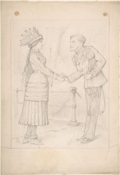 Editor: So, here we have "The Best of Friends Must Part" by Sir John Tenniel, published in *Punch* in 1878. It appears to be a pen and ink drawing, likely for print. I find the way the artist uses line work to create depth interesting. What’s your take on this image? Curator: Well, from a materialist perspective, I'm immediately drawn to the means of production here. This wasn't intended as a precious artwork in the traditional sense, but a reproducible image, destined for mass consumption in a weekly magazine. It served a social function. Editor: Social function, as in political commentary? Curator: Precisely! It is a commentary produced in an age of widespread consumption of illustrated magazines. We need to consider Tenniel’s labor here. He was a professional, creating images to shape public opinion. Editor: So, the materiality of ink on paper, reproduced en masse, is directly tied to the political message? Curator: Absolutely. The print medium allowed for the dissemination of this commentary to a broad audience. Notice how the characters' clothing signifies status and origin: it is also commenting on who can be "consumed" into society and by what mechanisms. Editor: The figures are dressed to represent Canada and its Governor-General… it’s a rather obvious visual metaphor, but you are focusing on how *Punch*’s format allowed such ideas to spread rapidly. Curator: Exactly. Understanding the materials and the publication process gives us insight into how ideas about empire and governance were circulated and consumed in Victorian society. Do you notice any additional materials or tools that support my perspective? Editor: That does make me see it differently. I hadn’t really thought about it in terms of production and consumption before. It is all about distribution of images. Curator: Glad to hear!