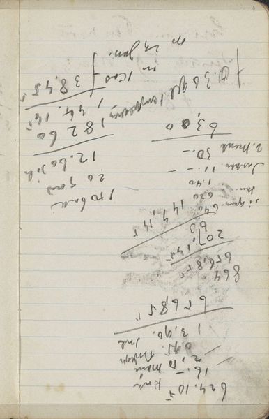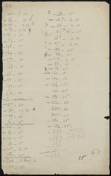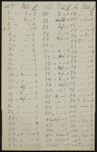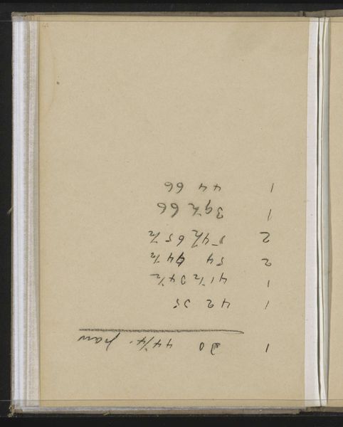 This is a page from Philip Zilcken's archive, an undated work comprised of ink on paper, now held in the Rijksmuseum. At first glance, we're confronted with a seemingly random series of numbers and notations, organized into a table-like structure. The composition is dominated by the contrast between the crisp, dark lines of the ink and the aged, off-white paper. The texture is smooth, save for the slight undulations of the paper and the varying thickness of the handwritten strokes. But what does it mean? The table's columns – labeled with headings like "Title", "Number", "State", and "Proof" – suggest a system, a cataloging of sorts. Each entry, with its unique set of numbers and annotations, points to an attempt at order. The numbers themselves take on a semiotic function, acting as codes that signify something beyond their numerical value. The table is not just a visual artifact but a container of information waiting to be decoded. Look at the precision of the handwriting, the way each number is carefully formed. This attention to detail highlights the artist's attempt to impose a structured order onto the world. It is the formal qualities of line and composition that reveal the underlying structural intentions of Zilcken's work.