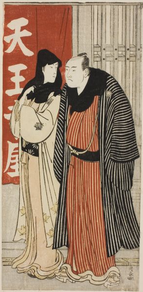 Curator: Before us is "The Dance of the Beach Maidens from the series Brocade of the East," a captivating woodblock print created by Torii Kiyonaga sometime between 1760 and 1780. What strikes you initially about this piece? Editor: Immediately, the physicality. Those slender poles the women carry across their shoulders supporting buckets are so finely rendered! I'm curious about the pigments, the specific dyes used to achieve those coral and black tones. You can almost feel the paper's texture. Curator: Indeed. The figures themselves, though serene, are loaded with symbolic meaning. The beach, for example, traditionally signified a liminal space in Japanese culture—a threshold between the mundane and the spiritual realms. Editor: Right, and their garments. I want to know where these clothes came from. We’re these kimonos something everyday or made for ceremonial work? How are the dyes integrated? Are they plant based? This isn't just a representation of daily life, it is the *thing* that tells the history of their world. Curator: Absolutely. The pine branch above, with its evergreen needles, suggests longevity and endurance. The artist is carefully constructing an idealized vision of feminine grace tied to these specific cultural touchstones. Notice the deliberate composition as well— the dynamic, yet harmonious balance of forms, directing the eye across the surface? It is evocative of classical themes as well! Editor: I do, and to bring us back to the material, there’s that amazing line quality that shows up when a skilled printer burnishes the paper on the woodblock! We’re talking multiple blocks, likely cherry wood—labor-intensive, highly skilled craftsmanship allowing the images to spread out. Curator: Precisely. The layering of meaning and technical expertise truly exemplifies the richness of ukiyo-e prints. Editor: Thinking about the social context really deepens the appreciation, doesn't it? Curator: It does indeed. Editor: Absolutely, it grounds the cultural symbols and speaks to its impact through the way it was made and where it may have spread. Curator: A perspective that is not lost as time continues.