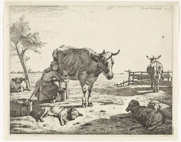 Curator: Here we have "Landscape with Cows" by A. P. Madsen, an engraving from 1847. Editor: My immediate thought is labor. The weight and the physical toil seem evident, not just on the burdened cow, but subtly across the entire scene. Curator: Exactly. The seemingly idyllic landscape is grounded in the material reality of agricultural life. This realism pushes back against romantic notions of nature. Do you see how the detailed etching emphasizes texture? Editor: I do. The fine lines describe the very stuff of this world— the rough hides of the cattle, the earthy ground, the working equipment. It’s about the labor of the animal, made evident through this intricate process of engraving. What is that apparatus attached to the front cow? Curator: That's a yoke. It’s a potent symbol of burden and agricultural work, and that evokes human dependence on these animals. Consider, too, how such visual signifiers cement cultural ideas surrounding labor, farm life and progress in this moment in time. Editor: But does that yoke necessarily symbolize negative ideas around labour? To me, it suggests an almost tender working relationship between humans and these bovine animals. After all, both contribute to society. Is that sentiment a stretch? Curator: I'd argue it depends on one's perspective, it can absolutely imply a level of tenderness or coexistence as you suggest, especially set against the backdrop of the era. What strikes me is how Madsen invites contemplation about this agricultural system that sustains a population, but has a profound impact on our animal cohabitants. Editor: I'm interested in how this realistic style emphasizes an often-overlooked social structure. An idealized farm scene omits so much. I find Madsen's truthful rendering far more impactful. This print acknowledges hard labor in agricultural communities. Curator: And how different realities are etched within these images. I agree, Madsen invites us to contemplate and perhaps question traditional societal expectations that underlie even genre-painting and landscape. Editor: This image stays with you, offering both stark realities and compelling nuances, a conversation sparked across centuries through a grounded rendering of cows and humans working together in fields. Curator: Yes, a perfect moment to consider cultural history—the continuity of rural practices depicted in simple materials that offer so much scope for investigation.