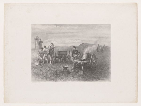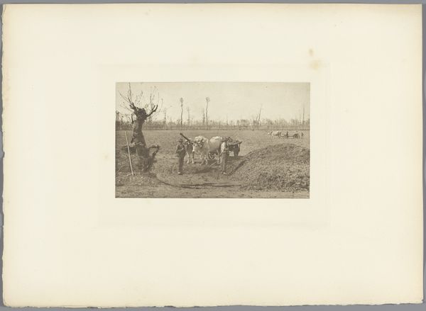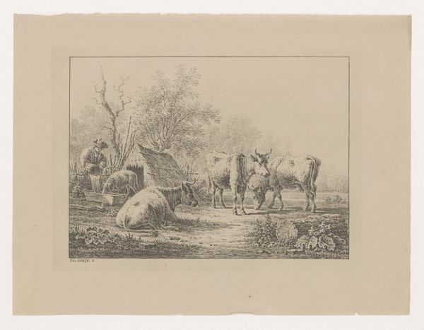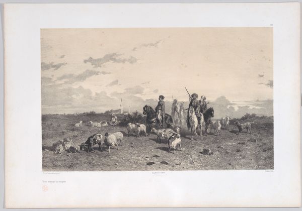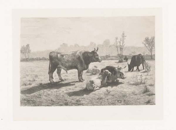 Curator: This is a photo reproduction of a painting by Jan de Haas titled "A Herd of Cows," predating 1863. Editor: It's serene, almost dreamlike. The soft focus lends it a pastoral tranquility, despite the presence of so many weighty bovine figures. Curator: Indeed. In looking at the reproduction itself as an object, and considering the period, we can unpack the emergence of photography as a technology democratizing art. Consider how reproductive technologies broadened access and reshaped artistic authority and the traditional hierarchies of value in art institutions. Editor: It does feel as if de Haas, or rather, Fierlants who made the photo reproduction, was consciously evoking the archetypal symbolism of the Golden Age. Think of the cow as a figure of plenty, prosperity, the embodiment of agrarian life. Their placid nature transmits a certain contentment, a communion with nature. Curator: And there is perhaps an undercurrent of class politics here as well, with this idealization of the rural, juxtaposed against growing industrialization of the time, where artists such as de Haas—through photography’s reproduction—can appeal to broader audiences, and make statements about the changing social landscape. Who has access to land, resources, beauty. Editor: That is so well observed! I would even venture into interpreting the light—the subdued palette. In its haziness I almost perceive a nostalgia—a yearning for a rural simplicity as the world hurtles towards modernity. It taps into a collective visual memory of what Europe was, or was perceived to be. Curator: So we begin to untangle threads of access, class, pastoral ideals, and memory interwoven within this singular photograph! Editor: Exactly. It leaves me pondering the nature of such enduring visual symbols, and our consistent human impulse to represent our relationship with nature. Curator: Precisely, this act of reproduction enables a democratization, albeit with the photograph still taken by someone like Fierlants of particular standing, with certain interests. Both access to technology, access to images is uneven. Editor: A nuanced vision, I agree. Well, that's certainly given me a lot to think about, especially the shifting currents of symbolism embedded here. Curator: Yes, the way art speaks across different axes of power, social status, and collective desire for an accessible art is worthy of ongoing inquiry.