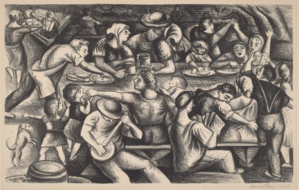 Lewis Daniel created this lithograph, "Gentlemen of the Jury," using a printmaking technique that allows for nuanced gradations of tone. The artist would have drawn with a grease pencil onto a flat slab of limestone, then chemically fixing the image so that it repels water and attracts ink. The resulting prints, like this one, can have a velvety texture and a deep range of blacks and grays. Here, the material qualities of lithography serve to intensify the scene's oppressive atmosphere. The close quarters and agitated figures, rendered through dense, swirling strokes, evoke the claustrophobia and tension of a jury deliberation. The medium's capacity for detail allows us to discern individual expressions of frustration and conflict, emphasizing the human element within the legal process. While lithography is an indirect means of image production, its reliance on the artist's hand and eye makes it a craft-based process as well, distinct from industrial printing. This blurring of categories aligns with the subject matter of the print, which suggests that the pursuit of justice is always subject to human fallibility.