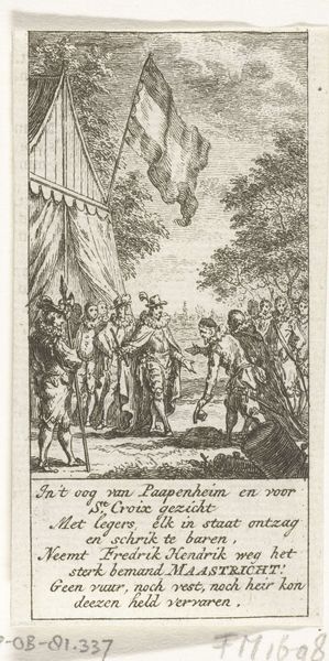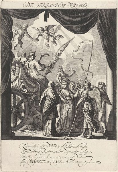This undated print by Simon Fokke depicts three historical figures before a naval battle. Note the angels, classical symbols of victory and divine favor, gracing the scene with laurel wreaths. Angels have long served as intermediaries between the divine and the human, their presence a potent signifier of triumph. The laurel wreath, too, echoes through time, from ancient Greece where it crowned victors, to its recurring use in Roman art to glorify emperors and military leaders. One cannot help but observe that the angel on the left, bearing a trumpet, is reminiscent of Fame, a symbol of glory. Consider its appearance on triumphal arches, Renaissance paintings, and even contemporary monuments—each time, its essence shifts, yet the underlying message of victory and divine sanction remains. Such imagery, ingrained in our collective consciousness, stirs deep emotions—a longing for recognition, a fear of oblivion. This enduring symbolism speaks to the cyclical nature of history, and the continuous reinterpretation of our shared cultural memory.