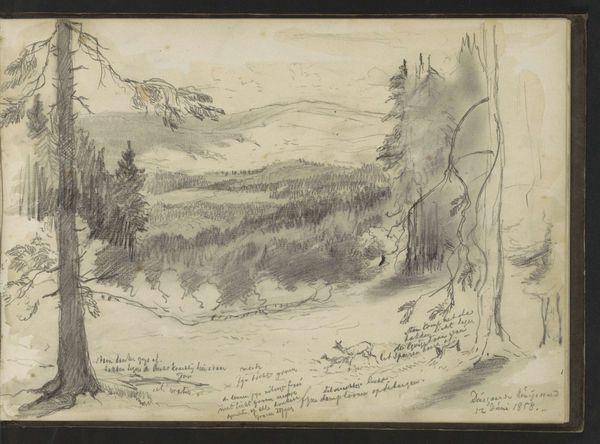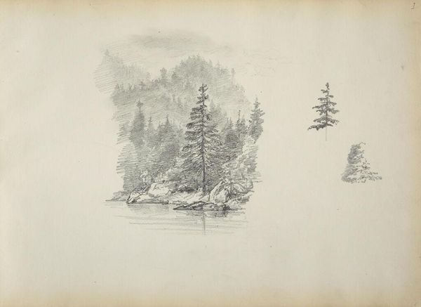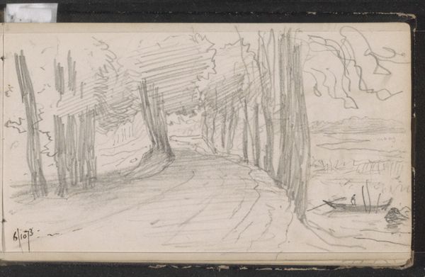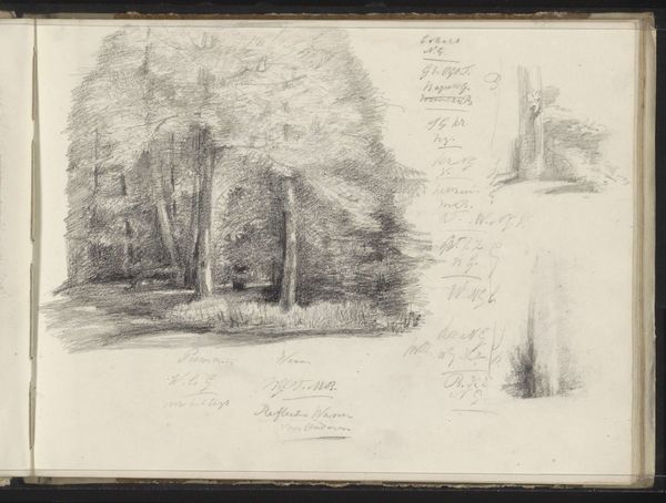 Curator: Immediately, the fragility of this artwork takes my breath away. It reminds me of fleeting memories, doesn't it? Editor: This is a sketchbook page featuring various landscape studies by Maria Vos, dating anywhere between 1834 and 1906, from the collection at the Rijksmuseum. It's pencil and ink on toned paper. Raw, unpretentious, revealing the material truth. Curator: Truth! Precisely. But also more than that; an aspiration toward truth... like a whispered secret. I imagine Vos standing in the Dutch landscape, just quickly capturing its essence and energy in her sketchbook. Editor: Absolutely, though consider the material conditions... access to sketchbooks, pencils, the time and leisure for artistic pursuits. These are class privileges, remember. Was this a pastime? Study material for larger commissions? I can imagine a debate surrounding production methods that values the swift skill that drawing from nature required. Curator: Mmm, it whispers something universal. Looking at that copse of trees reflecting in the still water; it's almost like the surface is a veil—like a portal! Editor: Portals are produced by other conditions. And that tone isn’t accidental: preparing paper requires certain manual labour that involved several actors with specific know-how. And for me, the pencil strokes! I am keen to see how such simplicity of process leads to intricate textures. It almost feels a trace of labor to me. Curator: But it's not only manual effort we’re looking at, it's about inspiration. Imagine how many sketches Vos made on days when the light and mist combined in some uniquely transporting manner. Editor: A nice thought. However, my point is this drawing involves an element of "making." Its apparent simplicity requires acknowledging layers of craft, labor and capital to allow those trees, forest trails and the water's edge in their final form to surface for us. It brings value to what art represents by what processes were involved too. Curator: You’ve helped me consider what such gestures signify, how they conceal as much as reveal; now I won't forget to think of how those processes influenced how her hand met the paper and allowed those landscape forms to emerge. Editor: Yes! And hopefully you can consider more often those who contribute at other material stages to provide and conserve the “space” we might interpret things as ethereal when their roots may be very real.