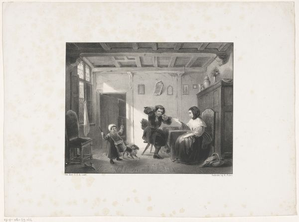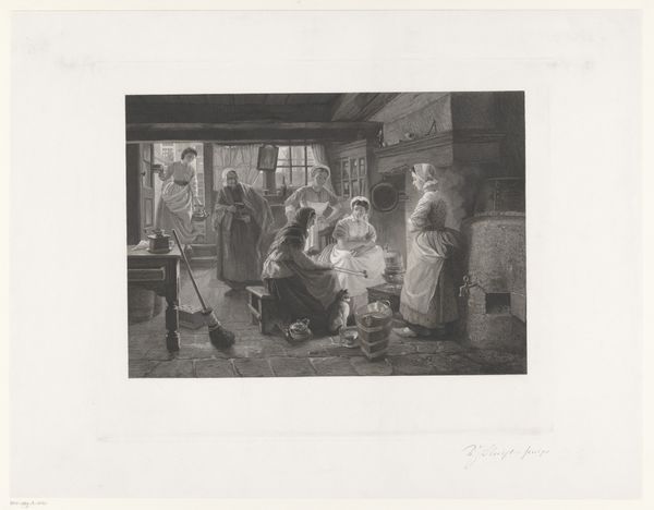 Curator: Welcome! Here we have “Seventeenth-Century Interior with Regents by an Easel," created between 1867 and 1874 by Jan Mesker. The piece before us is an engraving executed in pencil, currently residing here at the Rijksmuseum. Editor: The tonal range, immediately apparent, cultivates an ambiance of somber contemplation, doesn’t it? It's meticulously rendered; each figure seemingly positioned to facilitate the gaze around the orthogonal planes and sharp vanishing point. Curator: Indeed. Mesker skillfully recreates the atmosphere of 17th-century genre paintings with strong historical undertones. Observe the symbols of authority. The sober attire of the regents would evoke a specific meaning for viewers of the time, indicative of civic responsibility. The dog, perhaps symbolizing loyalty and vigilance. Editor: I appreciate the pointillist quality evident in rendering their garments; one must commend the execution! Furthermore, what is the importance of situating these figures next to what appears to be an easel, perhaps hinting at the act of portrayal? Or indeed art and power intertwined. Curator: Certainly! These symbols would create meaning for contemporary viewers who would understand their place in society. The setting enhances that too, as that space represents Dutch interiors: their domestic sphere filled with symbolism, all designed to enhance and reinforce those values. Editor: It’s interesting to ponder the absence of color in relation to baroque painting conventions, of course, given its black and white values only, however this aesthetic subtraction creates an interesting layer of commentary and a compelling dynamic interplay between representation and abstraction. Curator: Mesker gives us an echo, filtered through a 19th-century lens. But it's precisely that echo that allows us to understand more profoundly those symbols and their changing place within history and cultural memory. Editor: It’s fascinating how a focus on intrinsic details of form allows for such breadth of interpretations when engaging with the artwork. Thank you for shedding light on this work of Jan Mesker.