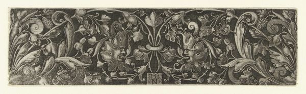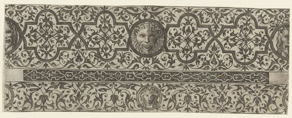 Curator: This pen and ink drawing, known as "Frieze with moresques, in the middle a mascaron," comes to us from an anonymous hand, dating roughly between 1528 and 1580. What strikes you first about this example of decorative art? Editor: The repetition is immediately compelling. I'm struck by how such a potentially rigid geometric framework yields to these very organic, flowing shapes. It’s as if constraint breeds a kind of liberated visual vocabulary. Curator: Yes, indeed! That tension is crucial to understanding moresques, those stylized foliate ornaments popularized during the Renaissance, particularly after the rediscovery of ancient Roman art. Here, the repeating frieze embodies that dialogue. Editor: When I view patterns from this vantage, I can't help but reflect on the way "ornament" is historically coded as "feminine," or lesser-than "fine art," obscuring labor and cultural meaning. Do you think that's at play here? Curator: A provocative point. Within this period, ornament functioned quite differently. Its ubiquity served almost as a common language, uniting visual elements across architecture, metalwork, textiles, and certainly, the printed image. This print may well have served as a pattern source for artisans of varied backgrounds. Editor: Interesting. And this face—the mascaron—at its heart... it brings a moment of starkly human presence. Is it apotropaic, meant to ward off ill fortune or embody something particular? Curator: That’s likely, yes. Masks in that time frequently operated within belief systems, meant to affect their surroundings either literally, or psychologically. Placed here in the very centre, this example may have been intended to guard creativity itself. Editor: In a world that is still very divided, art allows us to engage with this idea of both beauty and of purpose, in a symbolic way, in order to build something meaningful that is both decorative, creative, yet intentional in nature. It certainly brings a lot of symbolic weight here. Curator: Absolutely, reflecting on the capacity of artmaking. For an anonymous object, it prompts fascinating questions!