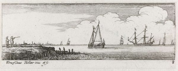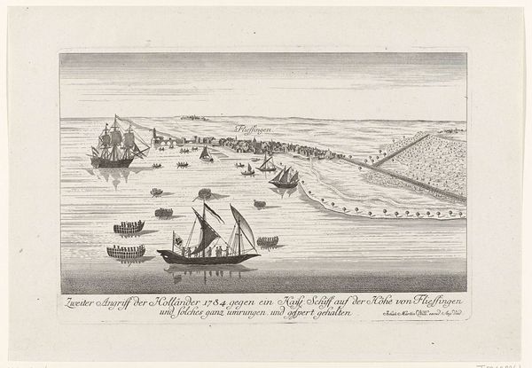 Editor: Right, so this is "Inslaan van verversingen op het eiland van San Sebastiaan, 1599," an engraving in ink by an anonymous artist, dating somewhere between 1601 and 1646, currently at the Rijksmuseum. The sheer level of detail is really striking, almost map-like, but there’s a definite narrative being presented here. What's your read on this? Curator: Oh, this piece sparks so many daydreams! It's like looking into a tiny, bustling world. The precision, almost obsessive in its rendering, does lean towards cartography, yet the drama suggests something more. Look at the placement of those ships, not just documenting their existence, but hinting at power, trade, perhaps even… plunder? And those figures on the shore, what are they doing? Negotiating? Laboring? Preparing for… what exactly? It's all so wonderfully ambiguous, isn't it? Editor: I suppose that’s why it feels more ‘scene’ than just geographical record, right? It really leaves me curious about that time. The detail is incredible, almost like you're there! How do you think an artist captures a world so foreign so well? Curator: It’s that marriage of the meticulous and the imaginative, I suspect. They were likely working from sketches, eyewitness accounts, maybe even exaggerated tales whispered across tavern tables. The artist synthesizes it all, adds their own slant, their own anxieties, their own hopes for the future – poof! – you've got history filtered through a wonderfully biased lens. Makes you wonder about the stories behind all the unmentioned elements, eh? Editor: Definitely something to consider. I hadn’t thought about the unseen narratives! This whole artwork feels different to me now, with all of those historical aspects considered! Thanks for pointing that out.
