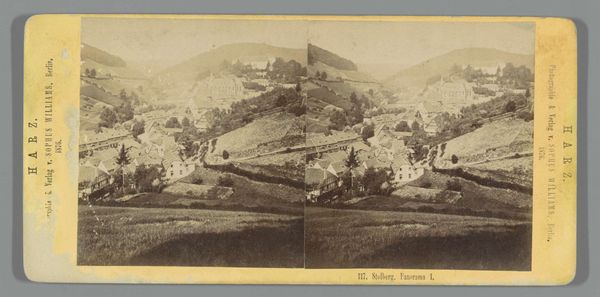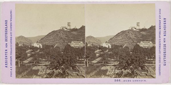 This landscape, "Gezicht op Braubach en de Marksburg op de heuvel, Duitsland" (View of Braubach and the Marksburg on the hill, Germany), was made by Anselm Schmitz sometime between 1831 and 1903. In it, the artist captures the medieval Marksburg Castle overlooking a town in Germany. This photograph was produced during a period defined by the rise of nationalism, and rapid industrialization, both of which profoundly shaped identity and culture. The image could be read as a nostalgic gaze back to an imagined idyllic past, an era before the disruptive changes of modernity. By focusing on the landscape and architecture, Schmitz evokes feelings of national pride and cultural identity. The castle, a symbol of power and history, sits imposingly above the town, reminding viewers of Germany’s rich heritage. There is an interesting contrast here, too, between the image of the vineyards with the hard, stone architecture of the buildings. This contrast highlights the relationship between nature and human development.