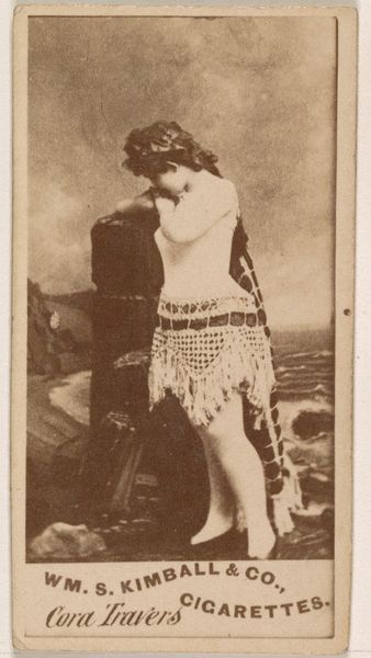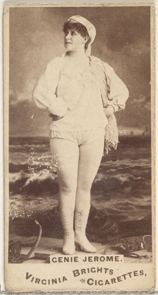 Curator: It has an ethereal, dreamlike quality, don't you think? Almost as if we’ve caught a glimpse into a nostalgic memory. Editor: Quite. And, here, before us, we have an intriguing artifact: "Card Number 142, Irene Verona, from the Actors and Actresses series." It was part of a set, N145-4, issued by Duke Sons & Co. in the 1880s as an advertisement for Cameo Cigarettes. Curator: It’s fascinating how these small commercial objects can reflect so much about the period, this actress gazing out to sea. The sepia tones imbue a kind of classic romanticism. What narratives were they hoping to conjure in their consumers’ minds? Editor: Absolutely. These were mass-produced prints utilizing photography and drawing. The aim was to associate the allure of stage actresses like Irene Verona with their product, creating a sort of aspirational link. Think of how tobacco companies co-opted sports figures, celebrities, or even exotic destinations, a kind of Orientalism pervades in their wider advertising strategies. Curator: This one has a foot both in reality and constructed ideals. Verona stands confidently on this painted shore, yet the symbol she presents has powerful continuity with feminine icons looking out to sea that date to Greek and Roman tradition. It presents an assertive woman, yet one who is looking outward and therefore subtly yearning or even hoping. Editor: That tension is palpable. We have a woman presented both as a performer in command of an audience, yet subtly positioned within prescribed gender roles. Tobacco companies were major promoters of this ideal woman within rapidly industrializing, patriarchal nations. And let's not forget the medium—these cards were inserted into cigarette packs. This proximity surely shaped how audiences received them. Curator: You can easily picture someone pulling this from a pack, tucking her portrait in a pocket or on a dresser mirror. In essence, this Irene Verona served as a symbol of elegance for a society undergoing immense changes and hoping to maintain an identity and an ideal. It makes us consider how even a mundane everyday item holds a strange potency of longing and hope. Editor: Yes, we see here, how something seemingly so trivial in this ephemeral promotion piece—acquires value and weight by the forces shaping our cultural narratives.