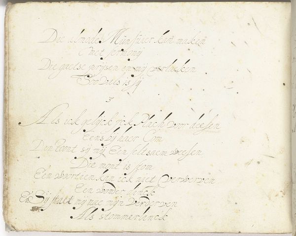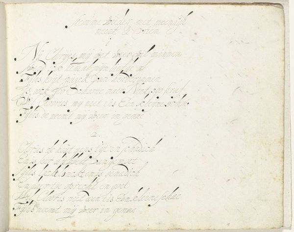 Curator: So, we're looking at "Poem with Praises to a Woman," a drawing by Gesina ter Borch from around 1646 to 1650. It's ink on paper, and currently residing in the Rijksmuseum. I am struck by the intimacy of the handwritten text, and I am wondering how we might unpack the meaning behind its presentation. What stands out to you? Editor: It looks like a page from a personal journal or sketchbook. The handwriting is beautiful, almost like calligraphy, but faded. What can we learn about the cultural and historical background here to understand what this poem praises? Curator: Ter Borch was part of a highly educated family. This drawing offers us a glimpse into the world of women and their intellectual lives in the 17th century. The act of writing, especially poetry, was often a carefully cultivated skill. These verses challenge the notion of women being relegated to domestic spaces only. Editor: That's fascinating! So, the "praises" could be an assertion of a woman's intellectual and emotional depth, challenging patriarchal norms of the time? Curator: Exactly. Ter Borch uses the seemingly private medium of the sketchbook to voice praise, likely of another woman, implicitly carving out a space for female authorship and relationships. How do you think the visual presentation complements or challenges the themes within the text? Editor: The intimate scale of the work definitely adds to that sense of a private, almost secretive, world. It makes me wonder who this woman was and what their relationship meant to Gesina ter Borch. Curator: Precisely. And, by situating this piece within broader intersectional narratives we see a glimpse of queer relationships. Understanding the networks in which ter Borch operated helps us appreciate the nuances of gender, identity, and politics embedded within this seemingly simple drawing. Editor: That's an eye-opening perspective. I didn’t realize how much context was packed into this single page. Curator: These historical fragments ask us to consider marginalized figures.