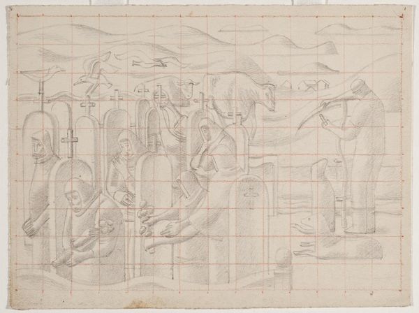Curator: Roberts's "Study for 'Hampstead Fair'" presents us with a preparatory drawing, around 1976 x 121 mm, unveiling the skeletal structure of a larger composition. What strikes you initially? Editor: The gridded paper speaks volumes about Roberts’ meticulous planning and production process. The geometric forms, almost robotic figures, hint at social commentary about the working class perhaps? Curator: It certainly highlights the mechanization of leisure. Considering Roberts’ background in lithography, this preparatory sketch demonstrates a deep understanding of reproduction and distribution. Editor: This study is fascinating within the history of leisure. It's revealing how society channels energy into escapism while simultaneously reinforcing class structures. The figures almost seem trapped within the fair's rigid structure. Curator: I agree, the sketch reveals the labor and the social implications of what we often perceive as carefree amusement. Editor: Exactly. I appreciate how this reveals the underlying tensions between enjoyment and societal constraints. Curator: And I am very interested in how this study makes visible the process, the steps involved in the making of art.