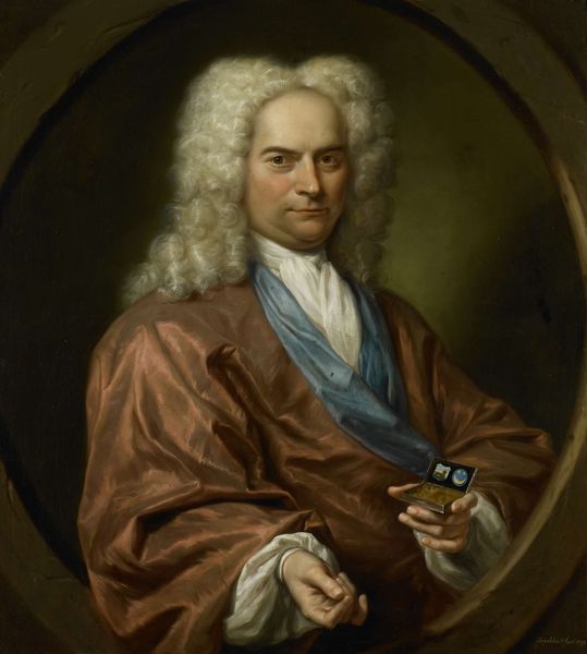 Editor: Here we have Cornelis Troost’s Self-portrait from 1739. It’s oil on canvas, and what immediately strikes me is the way he presents himself both as an artist and as a gentleman. How would you interpret this layered self-representation? Curator: It's a fascinating piece, particularly when considering the rise of the artist's self-image within 18th-century society. The prominent display of his palette and brushes firmly establishes his profession, yet his elegant attire and the classical architectural setting denote status and refinement. It begs the question, how did artistic institutions of the time, like academies, contribute to this elevation of the artist? Editor: That's interesting. So, the academies helped shape how artists wanted to be seen, and maybe how they wanted the public to see them, too? Curator: Precisely! Think about the Salon system in France, for example. It was less developed in the Netherlands at this time, but still. These institutions provided not only training but also a platform for artists to assert their place in society, leading to a shift from artisan to intellectual. Would you agree that the carefully arranged composition of the painting serves a specific purpose beyond mere aesthetics? Editor: Yes, definitely! The way he's framed, both literally within the painted oval and figuratively within the composition, suggests a very deliberate construction of his public persona. I wonder, was this type of self-promotion common, or was Troost pushing boundaries in some way? Curator: While self-portraits weren't entirely new, their function evolved. Before the 18th century, they often served as demonstrations of skill. Here, though, Troost seems to be making a statement about the social standing of the artist, blurring the lines between craft and high culture. Editor: It’s like he's saying, "I’m not just a painter; I’m a person of intellect and standing." That makes you consider the public perception of artists then, versus how we see them now. Curator: Indeed. And this painting becomes a visual document of that evolving perception. Editor: I hadn’t considered that interplay between social climbing, art, and institutions until now!