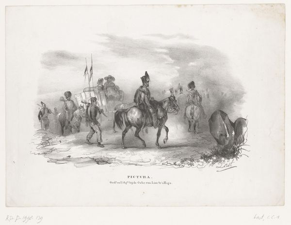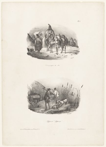 Editor: Victor Adam’s "Zeven voorstellingen van paarden en ruiters," created in 1833, shows seven little vignettes with riders and their horses, created with etching. It reminds me of a storyboard, like a quick collection of different moments around a single event. What strikes you most about this print? Curator: Well, immediately I'm charmed by its casual elegance! Each scene is like a fleeting memory, caught with a witty line. This piece is made by somebody who really deeply loved horses. You see it in the relaxed but careful anatomy. It’s like he is trying to quickly record their spirit on paper. What do you make of the variety of poses? Do you think there's a narrative thread connecting them? Editor: I hadn't thought of it as a potential story, but now I see it. Maybe each panel shows the stages of a single horse race, or perhaps several related races happening on the same day? The fallen rider at the bottom kind of suggests that! Curator: Exactly! And that’s part of the beauty, right? Adam invites us to complete the story ourselves, using these wonderful scenes like little sparks to ignite our imaginations. It's historical, but also feels incredibly relevant today - you can tell these guys were having *fun*. Can’t you almost smell the grass and hear the thundering hooves? Editor: You're right, it's incredibly evocative. I was initially drawn to the simplicity, but now I appreciate the layers of interpretation. It is less a snapshot of an event and more like an invitation to relive it, complete with all its smells, sounds, and motion. Curator: Precisely. And that, my dear friend, is the magic of art!