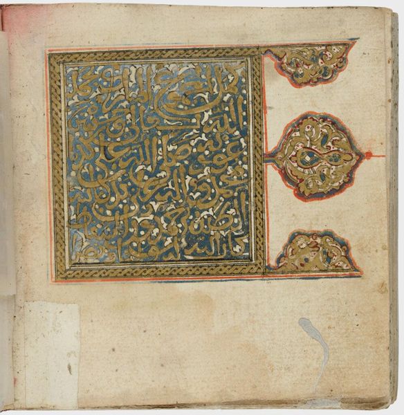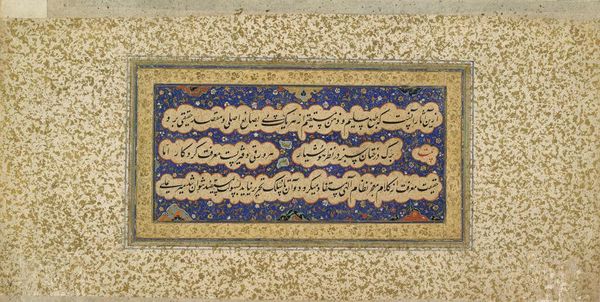 Curator: Here we have folio 3 from a Manuscript of Yusuf va Zulaykha by Jami, specifically the Frontispiece, Introduction (recto), and Opening Chapter (verso), crafted by the scribe Shah Mahmud. Editor: The geometric patterns immediately strike me. The blue and gold resonate with a sense of preciousness, like looking into a jewel box. Curator: Indeed. The materials, likely including ground lapis for the blue and gold leaf, would have been highly prized. Notice how the text is structured, almost like brickwork. Editor: The brickwork also creates an impression of building, perhaps the foundations of the story, or the architecture of love that's central to Yusuf and Zulaykha's tale. I also see visual echoes of paradise. Curator: I'm drawn to the physical labor involved. The scribe, Shah Mahmud, would have needed meticulous control to achieve such fine detail in the illumination and calligraphy. Editor: Thinking about it, the symbolism is about the journey of the soul towards divine love. Curator: Yes, it's fascinating how process and meaning intertwine in this artwork. Editor: It is a reminder that beauty can be found in both the making and the meaning.