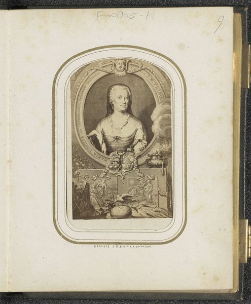 Editor: Here we have what's thought to be a photogravure reproduction of an engraving of Maria II Stuart, the wife of Prince William III, dating back to between 1860 and 1880. Looking at this print, the first thing that strikes me is how it uses Baroque visual conventions, like the portraiture and decorative flourishes to convey royal power in an era far removed from the actual monarchy, even as the original work from 1688 would itself serve to bolster dynastic prestige. What jumps out at you, seeing it now? Curator: That's a sharp observation. For me, it's intriguing to consider why this image of Maria II was being reproduced in the late 19th century, seemingly far from her actual reign. Think about the social and political context then. Photography had revolutionized image production, but historical portraiture, especially of monarchs, served specific public functions. What role did visual representations of historical figures play in shaping national identity during that era of rapid social and political change? Editor: It's interesting how a relatively simple portrait could speak to broader questions of nationhood and social memory, in addition to merely showcasing aristocracy. I never considered how the proliferation of images might have influenced public perception. Curator: Exactly! Was this reproduction aimed at solidifying a sense of shared British history, or perhaps at reinforcing the established social order? Whose interests were being served by circulating images of royalty, even those from centuries prior? Were these widely available or directed toward elite circles? And considering that the artwork seems to come from an album page, to what use was it directed? Editor: I hadn’t considered the intended audience for these types of reproductions, just how the image appears. It challenges my perception of "historical" art; these engravings continued to influence culture in their reproductions, for example in these albums! Curator: Precisely. Understanding that ongoing influence is key.