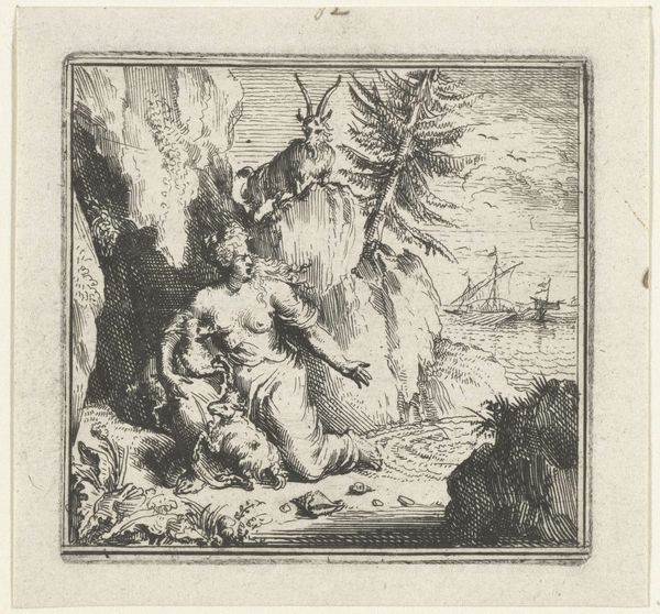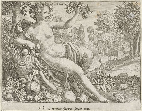Curator: This delicate etching, simply titled "Aarde," meaning Earth, is an intriguing piece from the late 17th to early 18th century. Its artist is currently listed as anonymous here at the Rijksmuseum. Editor: My first impression is of abundance tempered by fragility. There’s a sort of rough innocence to the line work, which also renders a weighty-looking infant nearly collapsing beneath the harvest. Curator: It’s tempting to view this through the lens of social and political commentary. The sheer weight of the fruits of the earth are placed upon this small, naked child. What burdens are we placing on future generations, especially concerning the distribution of resources and the realities of labor? Editor: Well, certainly such symbolic readings were common during that era. Think about the development of Dutch identity, particularly in relation to agriculture, land reclamation, and global trade, as well as the politics surrounding ideas about plenty and overabundance. Were printmakers attempting to both represent and shape those discourses? Curator: Exactly! Also consider that the drawing implement clutched in the child's other hand is most likely a builder's triangle, suggesting humanity's imposition on the land—perhaps, a signal to reflect on who benefits and at what costs. Even the ambiguous structures in the distant landscape hint at the complexities of early urbanization and land ownership. Editor: And there's definitely a dialogue to be had about the very style here, too. Look at the delicate sketch work! Such accessible prints and sketches were instrumental in conveying and normalizing very particular ideas across a broader section of Dutch society. They influenced perception. Curator: It is thought-provoking to see these visual languages translated across centuries, allowing us a glimpse into the values, contradictions, and power structures embedded in the art of the past. It reminds us that art is not a neutral reflection, but rather an active participant in shaping our understanding of the world. Editor: Indeed. This sketch is more than just an aesthetically pleasing object; it's a lens through which we can examine the intricate tapestry of history and human interaction with the Earth.