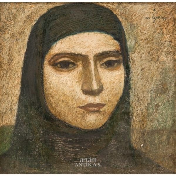 Curator: The intensity in this “Untitled Portrait” really grabbed me. It's raw and immediate, isn't it? Editor: It’s haunting, almost unsettling. Those large, watchful eyes dominate the composition. There's a vulnerability, yet a defiance, fighting for space on that canvas. It gives off a subtle, dark moodiness that has really got my interest. Curator: Exactly. The artist, Nuri Iyem, doesn't give us an easy read. There’s no date assigned to the work, which to me only adds to its mysterious appeal, forcing us to consider the timelessness of human emotion. The application of oil paint feels almost frantic in places, those brushstrokes are filled with anxiousness, lending an air of quiet tension to her appearance. Editor: And that muted color palette reinforces the feeling. It looks like the colors are restrained by the dark tones, giving us the suggestion of both strength and hidden pain. I'm thinking about what this portrait might represent politically – is this perhaps about hidden identities and resistance against a repressive society? It is about reclaiming power through representation when other forms of expression were denied? Curator: I can see that reading of it for sure. I wonder too about what Nuri was drawing on for inspiration while they were crafting this piece and layering on the emotional density of its meaning; their inner thoughts are what shine brightest here. Editor: Absolutely, but also the outside forces that influenced Nuri are important too. I believe this could speak more generally to the limited artistic possibilities and exhibition circuits accessible for a woman at the time of creation, whatever era that might have been. We are often reminded, whether consciously or not, of how many talented women found pathways through portraiture because other doors remained resolutely closed. Curator: Ultimately, that tension is where the portrait’s strength lies. It isn't just a painting; it's a confrontation, a mirror reflecting back something profound about ourselves, and the world. Editor: A poignant reminder of the ongoing dialogue between artist, subject, and society, rendered with captivating intensity. This piece asks us to reflect on these faces, as much for their own stories as the tales they can tell us about our societies.