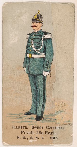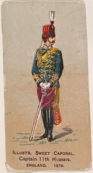 Editor: Here we have a rather dashing "Captain, 19th Hussars, England, 1879" print. It was made by the Kinney Tobacco Company around 1888 as part of their Military Series. The drawing has an almost uncanny, hyper-realistic quality given that it's printed on a small, thin card. What stands out to you? Curator: Let's not overlook its initial function: advertising. The print isn’t merely decorative, but a commodity circulated to promote Sweet Caporal Cigarettes. I'm interested in the labor that went into the making of the image – the artists involved, the printing processes, and how this labor connects to a larger network of capitalist production. Think of the material conditions behind mass-produced imagery. Editor: So you are suggesting that it might be too easy to separate the artistic merits of the image from the means by which it was created and disseminated? Curator: Exactly. Look at the level of detail lavished on the uniform. Consider the target demographic. Cigarette cards like this aimed to cultivate aspirations in their consumers, creating a subtle link between military prowess and the act of smoking. How did such seemingly innocuous cards contribute to the creation of a heroic image around warfare, linking the ritual of smoking with ideas of bravery? Editor: That's fascinating! It reframes my perspective. I was so focused on the individual depicted, that I had missed this reading about the material and historical factors behind its making. Curator: Thinking materially asks us to consider how even small-scale objects like this played a part in the larger workings of power and cultural production. And it makes one wonder how we create power through the commodities we make and buy. Editor: I’ll never look at a trading card the same way again! Curator: Nor will I. Let's consider the environmental impact next time.
