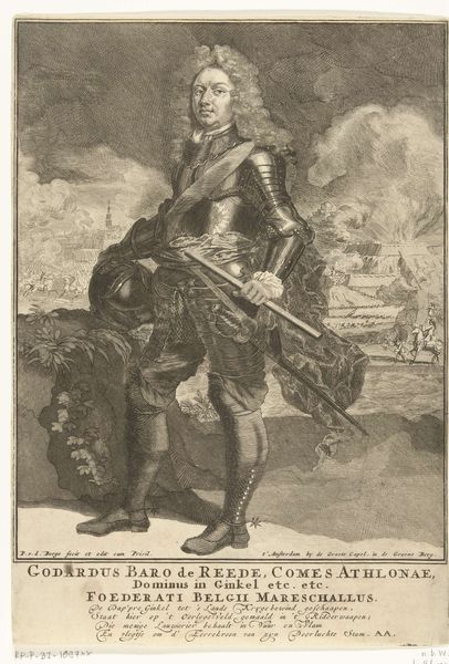 Editor: Here we have an engraving from sometime between 1591 and 1629, titled "Apostel Jakobus de Meerdere (Jacobus Maior) als pelgrim," or Apostle James the Greater as a Pilgrim, attributed to Johan Barra. I'm struck by how deliberately staged it feels; he is almost posing mid-stride. What stands out to you in this image? Curator: What strikes me is how this print participates in the Catholic Reformation's visual program. The figure of St. James, elaborately costumed as a pilgrim, wasn't simply a religious icon. He becomes a carefully constructed advertisement for pilgrimage itself, reinforcing the importance of sacred journeys at a time when Protestant theology was challenging these practices. Editor: An advertisement, really? Curator: Yes, think of it. Pilgrimages were not just personal spiritual quests. They were deeply entangled with economics, politics, and the very structure of the Catholic Church. By depicting James in such detail, with the trappings of his journey – staff, hat, water gourd – the image visually legitimizes and encourages participation in pilgrimage. Consider the cities visible in the background. How are those real pilgrimage destinations, such as Santiago de Compostela, being visually promoted? Editor: So it’s not just about faith, but about the institution? Curator: Precisely. It's about reinforcing Catholic traditions, visually countering the critiques of the Protestant Reformation and asserting the continued significance of the Church's practices and structures in everyday life. This print becomes part of that wider cultural and political battle. Editor: I never thought of religious art as a form of political messaging! This definitely gives me a new way of looking at art.